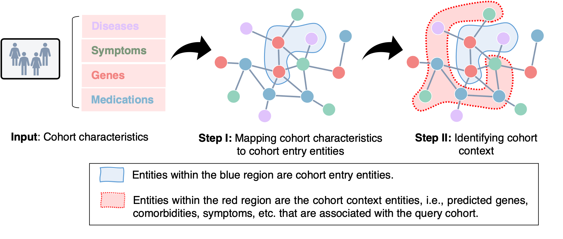Given characteristics of a cohort (INPUT), the module will return cohort context in iBKH, i.e., cohort context entities (CCE) such as genes, pathways, drugs, diseases, symptoms, etc. which are potentially associated with the query cohort.